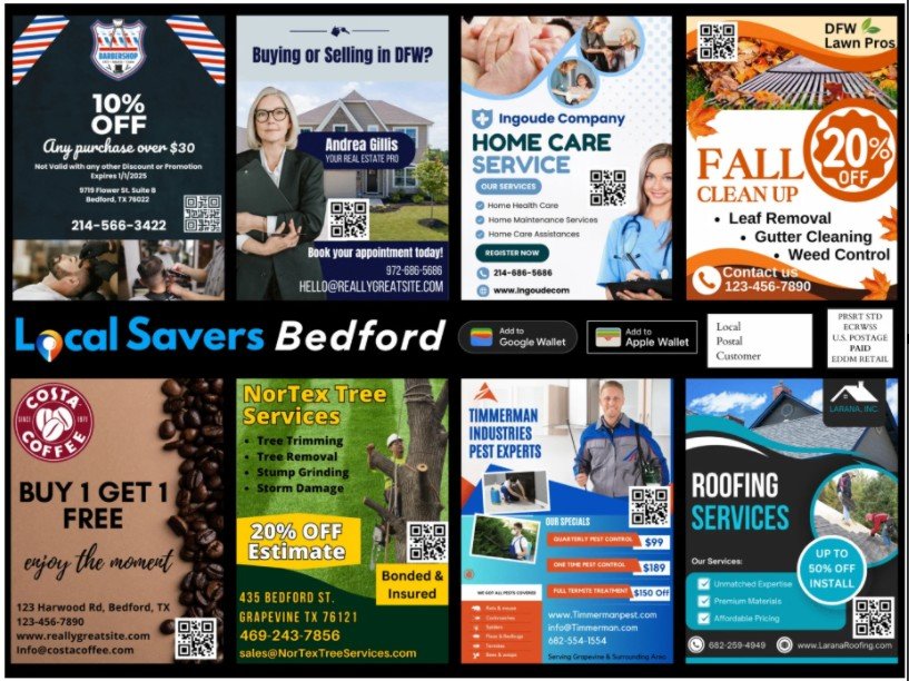 Exciting news! If you are a local business in DFW, you now have the opportunity to be a part of a huge 9″x12″ monthly postcard going directly to the residents of Bedford. By teaming up with 15 local non-competing businesses, marketing is made possible for a ridiculously low cost.